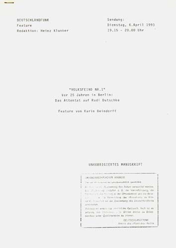 | Treffer: 34 | 01.00.00.00 - Außerparlamentarische Opposition 01.11.00.00 - - Rudi Dutschke |